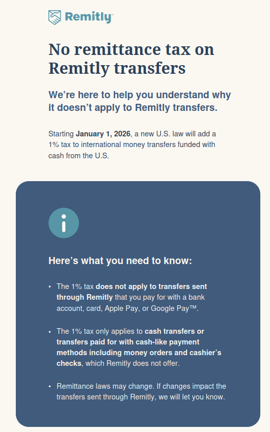No Tax on Remitly TransfersPublished by Fudgy McFarlen on July 26, 2025 Money transfer tax Categories: 0 Comments Leave a ReplyYour email address will not be published. Required fields are marked * Name * Email * Website What's on your mind? Δ